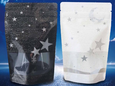 黒は神秘的でシック、白は優しくファンタジックな雰囲気のチャック付きスタンド袋です。