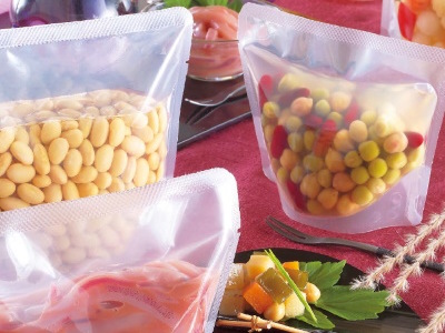 冷凍(-40℃)・加熱殺菌(90℃×30分)対応のチャック付きスタンド袋です。