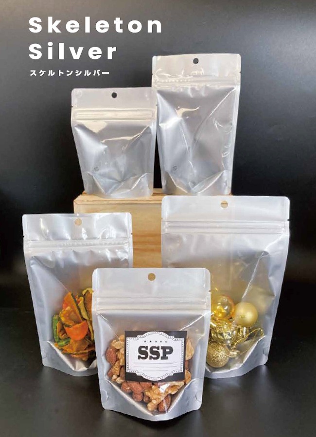 ○背面が透けて見えるスケルトンシルバーのチャック付きスタンド袋です。