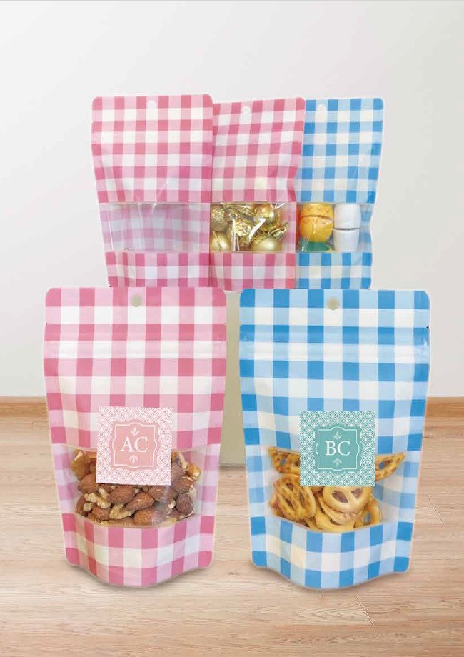 ○チェック柄で表面は窓付きのチャック付きスタンド袋です。