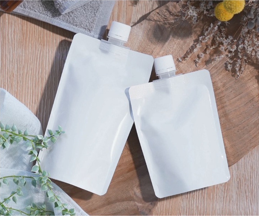 ○センタースパウト付きのアルミ蒸着・白印刷のスタンド袋です。