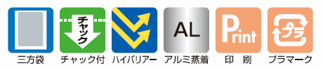 ○防湿性・ガスバリアー性に優れたアルミ蒸着構成のチャック付き三方袋です。