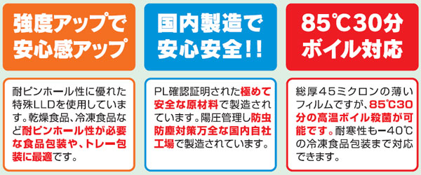 ○-40℃の冷凍食品包装から、85℃×30分のボイル殺菌が可能です。