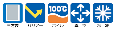 ○低温性(-40℃)に優れ、加熱殺菌(100℃×30分)対応の真空パック用三方袋です。