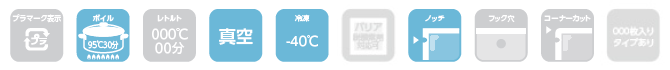 ○-40℃の冷凍から95℃30分のボイル殺菌にも対応しています。
